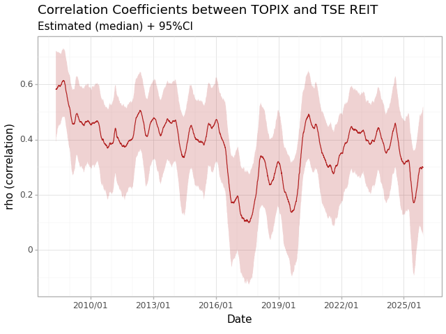 これと整合的な結果が得られましたが、時期によってはそれより小さいことも大きいこともあることが分かり、市場の変化に追随できることを示せました。また、各時点での相関係数の信用区間を示すこともでき、不確実性の程度が分かるのもよい点です。